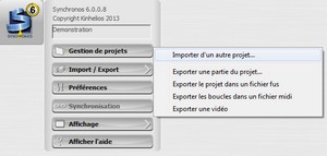 Pour lancer l'import de projet, vous devez cliquer sur le menu Synchronos puis sur "Import / Export" et choisir le menu "Importer d'un autre projet" |
