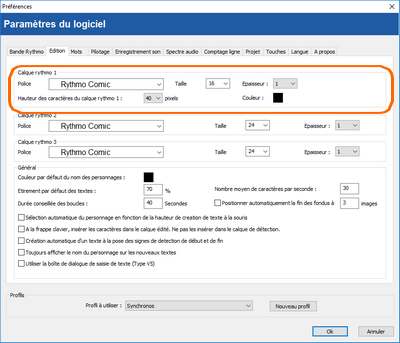 Vous pouvez choisir la police et la taille de la piste Rythmo 1 dite de détection. Il est conseillé d'utiliser la police Rythmo Comic afin de profiter des signes de détection prédéfinis.